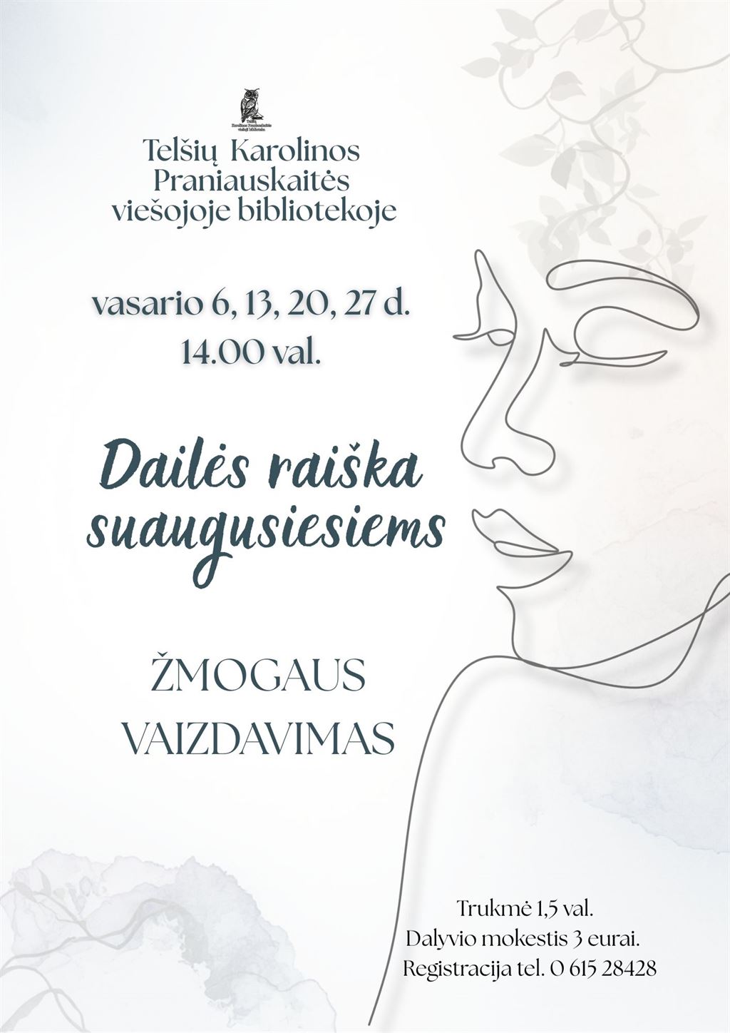 Registruojamos atskiros grupės vakaro kūrybos ir dailės raiškos užsiėmimams tel. 0 615 28428.