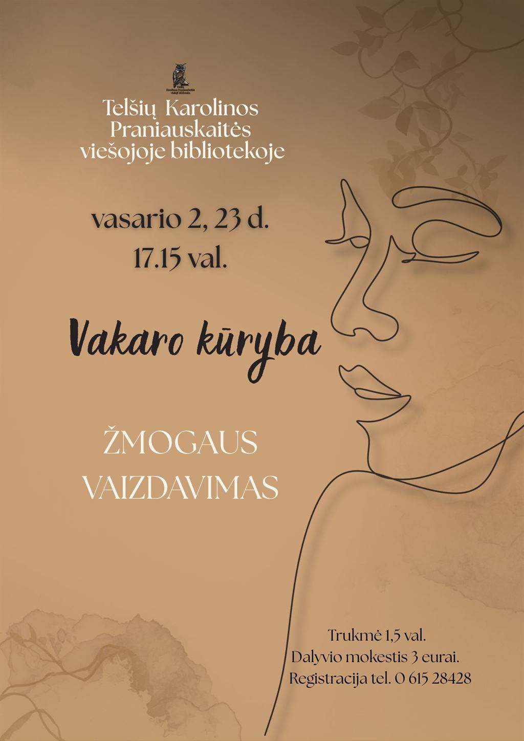 Registruojamos atskiros grupės vakaro kūrybos ir dailės raiškos užsiėmimams tel. 0 615 28428.