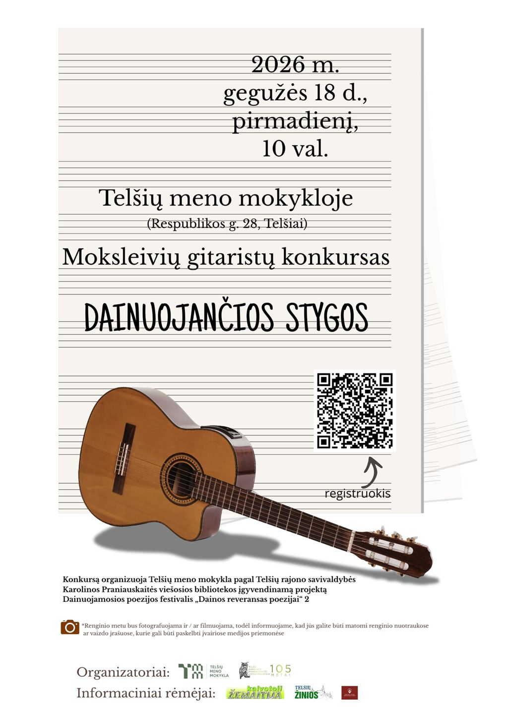 Konkursas „Dainuojančios stygos“ vyks 2026 metų gegužės 18 d. 10.00 val. Telšių meno mokykloje (Respublikos g. 28, Telšiai).