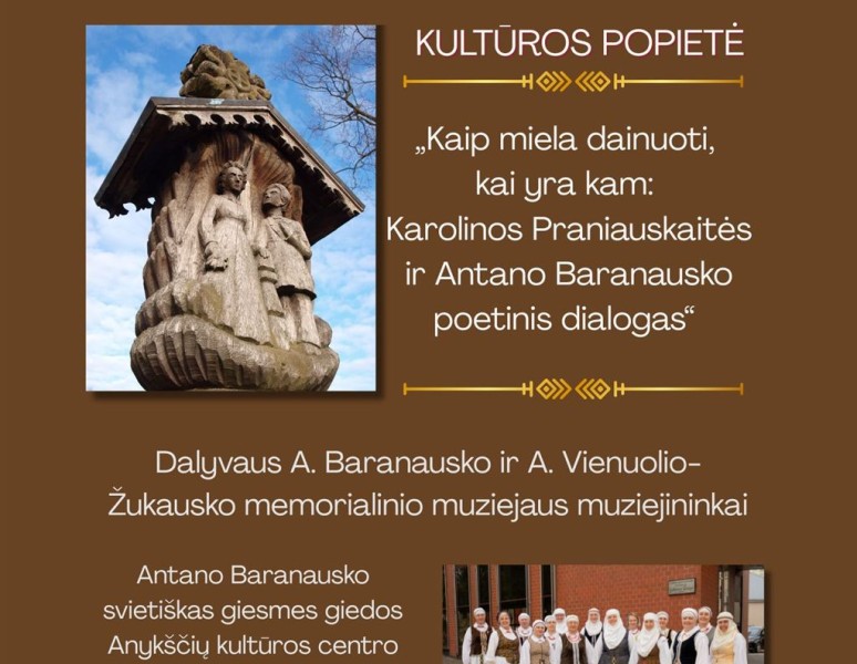 Kultūros popietėje Anykščių giesmininkės ir muziejininkai pabandys pakeliauti 1855–1859 metų laiku, poetų vienas kitam skirtomis eilėmis bei A. Baranausko svietiškomis giesmėmis priminti tragiškos sielų simpatijos istoriją.